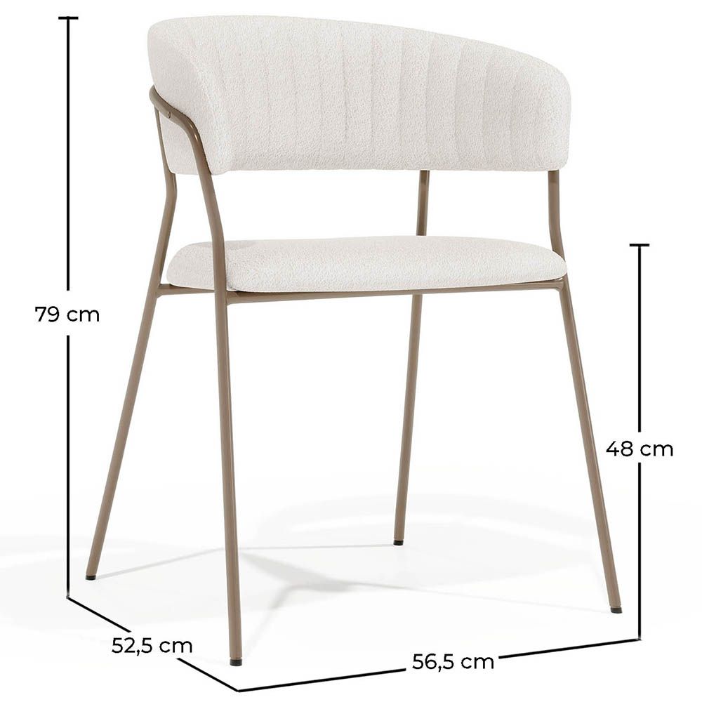 A cadeira de jantar estofada em tecido bouclé, com uma estrutura metálica na cor champanhe, é uma peça elegante e versátil que combina perfeitamente estilo e conforto. O seu estofamento em tecido bouclé proporciona uma textura suave e acolhedora, oferecendo uma sensação de luxo e conforto para aqueles que se sentam nela. Esse tecido também é durável e resistente ao desgaste, tornando-o uma opção ideal para espaços de grande movimento, como hotéis, restaurantes e também para o lar. O metal utilizado na sua estrutura é resistente e robusto, garantindo uma base sólida e estável para a cadeira. Além disso, a cor champanhe é elegante e versátil, permitindo que se integre perfeitamente em diferentes estilos de decoração.