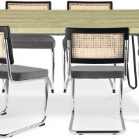 Este pack de mesa com pernas hairpin e 6 cadeiras de madeira com assento de veludo é perfeito para restaurantes, cafés e hotéis. A mesa de estilo industrial tem pernas em forma de garfo que lhe dão um toque moderno. As 6 cadeiras de jantar têm um encosto de rattan natural com um design de palhinha, o que lhes confere um estilo boho chic muito especial. O assento de veludo é macio e confortável, perfeito para desfrutar de uma refeição ou de uma bebida em boa companhia.