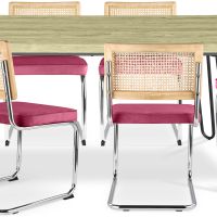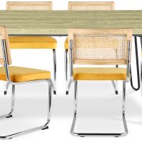 Este pack com uma mesa de madeira com pernas hairpin e 6 cadeiras de madeira com assento em veludo é um produto de qualidade premium, duradouro e luxuoso. É ideal para restaurantes, cafés e hotéis. A mesa de estilo industrial tem um design único com pernas em forma de garfo e as cadeiras têm um encosto em rattan de estilo cannage que dará ao seu espaço um toque de elegância. Aposte neste conjunto a um preço muito especial.