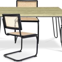Este pack contém uma mesa de jantar com pés em forma de garfo de estilo industrial, ideal para restaurantes, hotéis e cafés. Tem também uma superfície lisa e resistente aos riscos, sendo ideal para uso diário. As cadeiras em rattan trançado são altamente duráveis e robustas, e o design cannage é perfeito para ambientes de luxo. O mobiliário de estilo boho industrial é a escolha perfeita para quem procura um estilo único e autêntico.